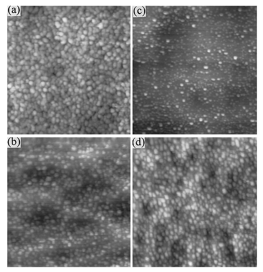 | Fig. 3. 1x1 µm² AFM images of (a) 8 ML of (In, Mn)As grown on GaAs (100), (b) 6 ML211 of (In,Mn)As grown on GaAs (211)B, (c) 6 ML211 of InAs and (d) 9 ML211 of (In,Mn)As grown on GaAs (211)B. All grown at 350oC. |