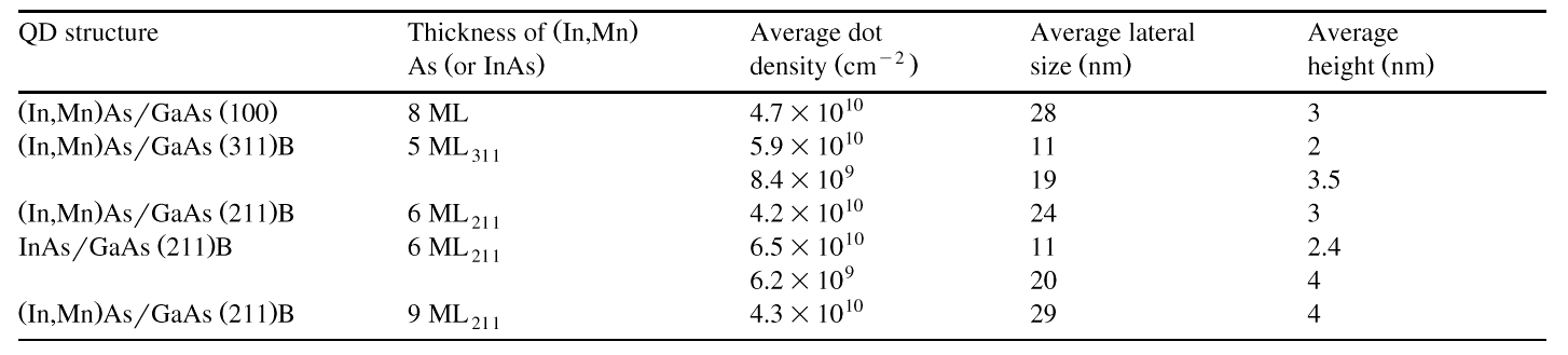 | Table 1 The average dot density, the average lateral size and the average height of (In,Mn)As (or InAs) QDs grown at 350oC on various GaAs substrates. |